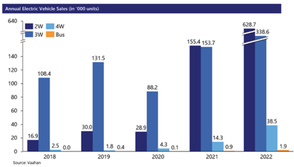 Electric vehicle (EV) sales in India witnessed a significant transformation between 2018 and 2022. Initially, the adoption of EV had been sluggish, with the market not gaining much momentum until 2019. However, from 2020 onwards, EV sales across vehicle categories experienced an explosive surge, driven by various factors. One of the key driving forces behind the rapid growth of EV sales was the Indian government’s push towards electric mobility. The government’s commitment to promoting sustainable transportation played a pivotal role in inspiring greater interest in EVs.